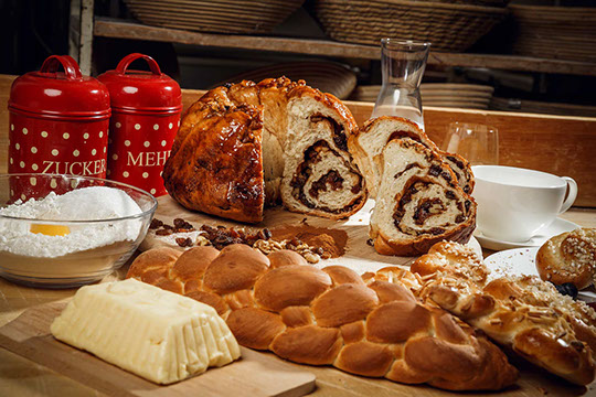 ZUTATEN: Bio-Weizen, Bio-Eier, Bio-Butter, Bio-Zucker, Salz, Bio-Malz, Bio-Zimt, Bio-Rosinen, Hefe, Bio-Zitrone, Rum und auf Wusch mit Bio-Nüssen.
