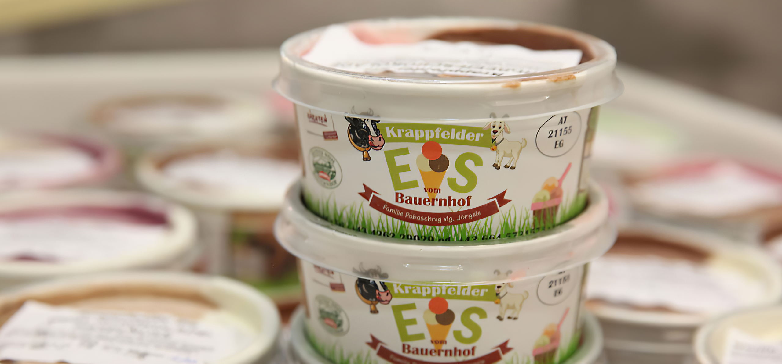 Krappfelder Eis vom Bauernhof wird seit seit 2013 von der Familie Pobaschnig auf einem Bio Bauernhof produziert. Als Eis-Manufaktur die Hersteller mittlerweile über 50 Sorten. Einige Sorten werden auch als 100% biologisch angeboten. Bio-Kuhmilch oder Bio-Ziegenmilch sowie frische Früchte und ausgewählte Zutaten bilden die Basis für das Krappfelder Eis. Sorgfältig hergestellt nach feinster handwerklicher Tradition - direkt am Bauernhof.
